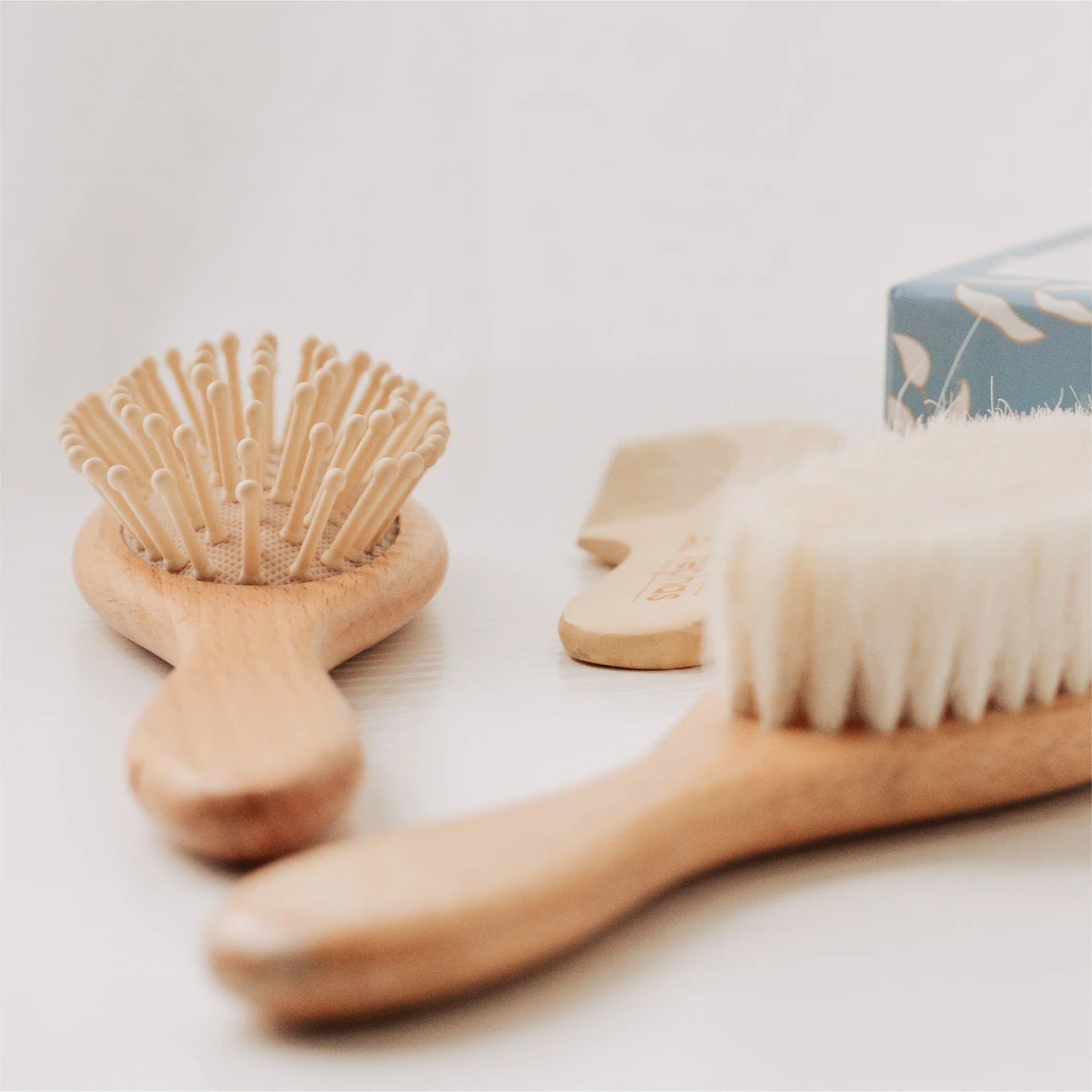 The Soft Brush is made with natural goat hair bristles and a natural beech wood handle. The Wooden Bristle Brush is made with natural wooden bristles and a beech wood handle. Both brushes are made of solid beech wood while the comb of maple wood. These brushes reduce static on baby’s hair and clothing, while also being water-resistant.