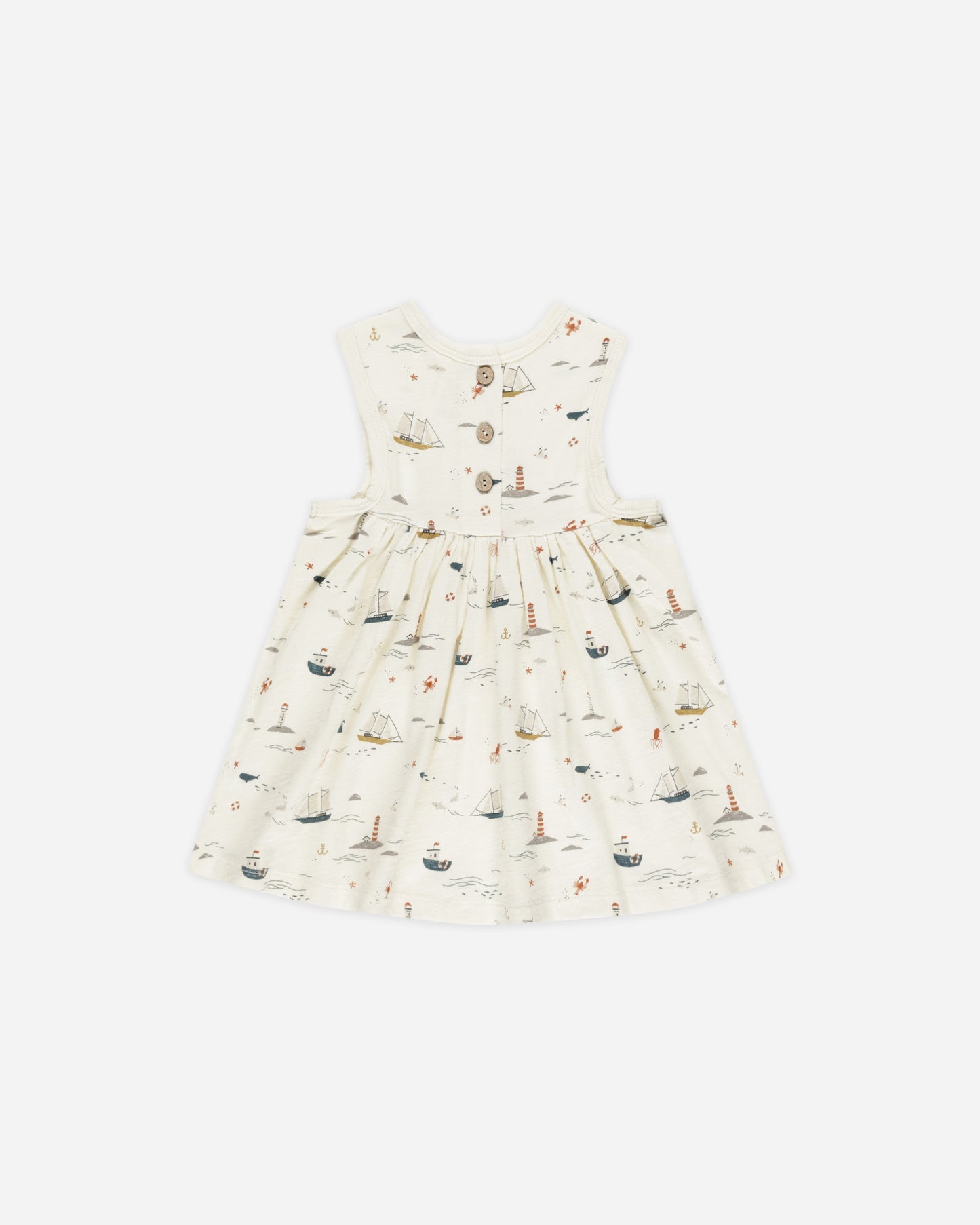 Sleeveless babydoll dress made from the softest cotton jersey, featuring a gathered skirt + buttons at the back neck.