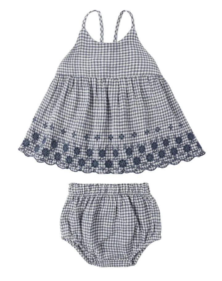 Featuring a ‘marine gingham’ print with beautiful eyelet embroidered detail. This summery blue gingham is perfect for your warm weather wardrobe.