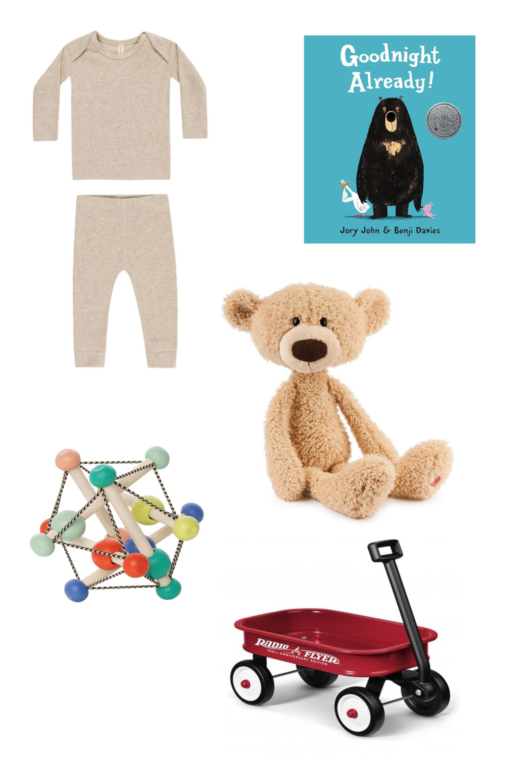 Big: Quincy Mae Ribbed Tee and Legging Set - Taupe, Manhattan Toy Skwish Colorpop, Gund Toothpick Bear, ‘Goodnight Already’ hardcover book; all packaged in a Radio Flyer Wagon, wrapped with cellophane & ribbon and sent in a Just Hatched Gift Box!