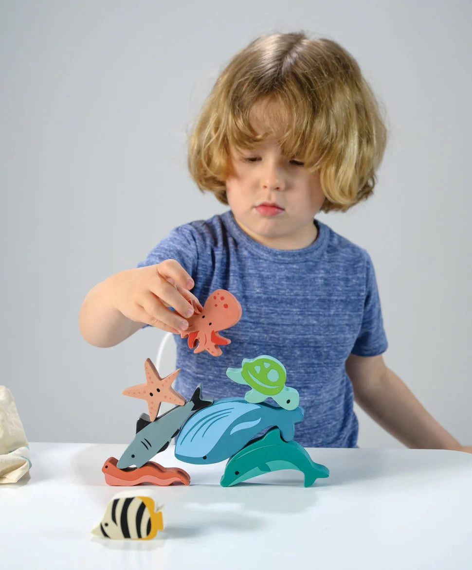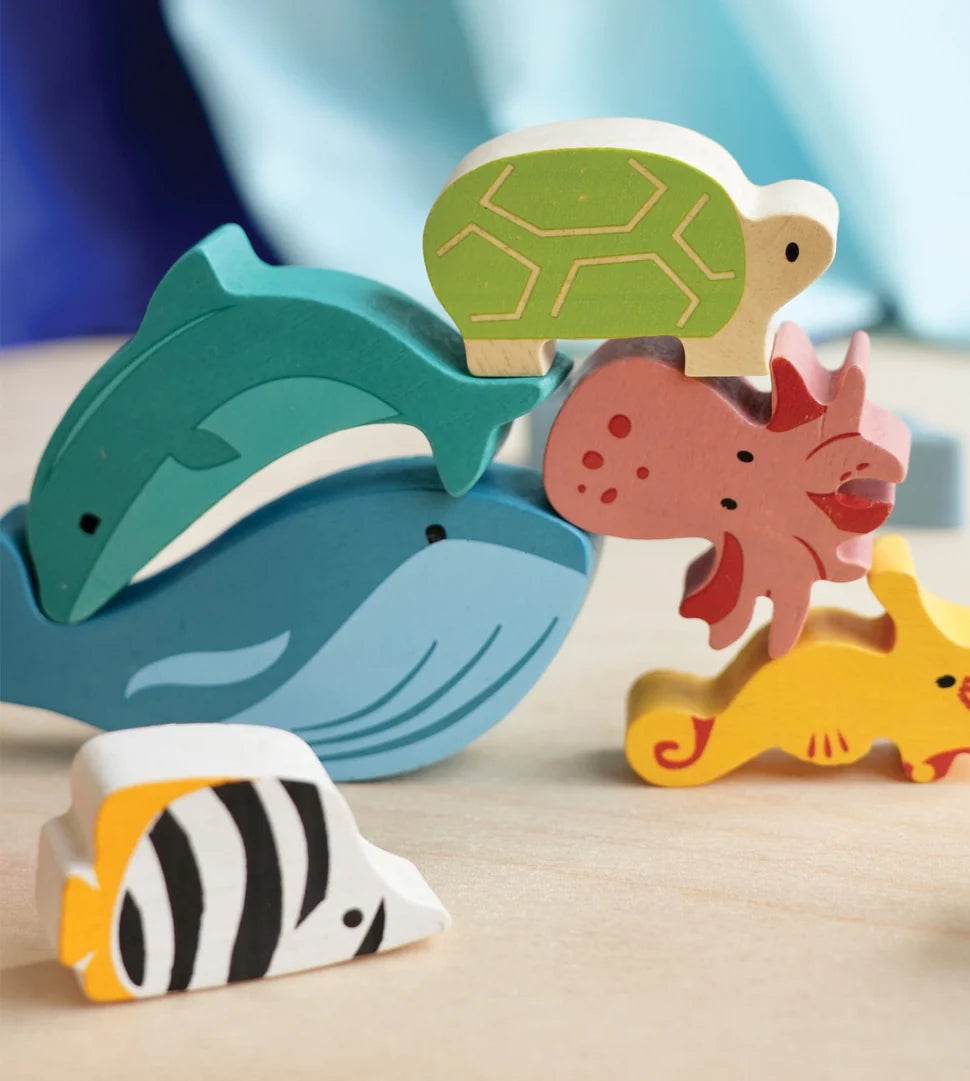Our Happy Stacking Ocean Set includes a whale, dolphin, turtle, seahorse, starfish, octopus, shark, an eel, and an angel fishnicely packed in an illustrated drawstring bag.