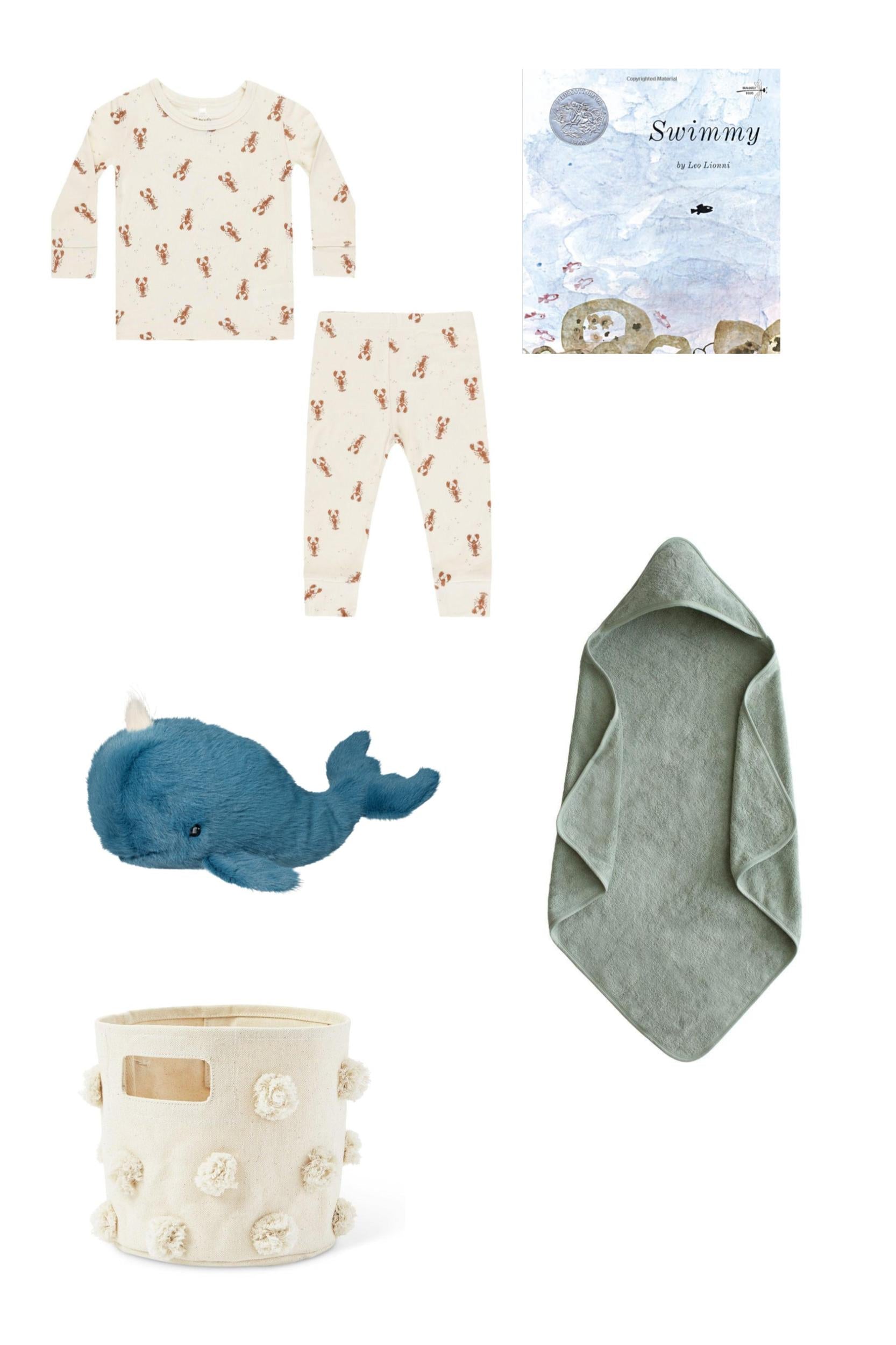 Big: Rylee + Cru Long Sleeve Pajama Set - Lobsters, ‘Swimmy’ Hardcover Book, Douglas Marina Whale, and a Mushie Organic Cotton Hooded Towel-Moss; all packaged in a Pehr Pom Pom Basket (mini/natural), wrapped with cellophane & ribbon, and shipped in a Just Hatched Gift Box!