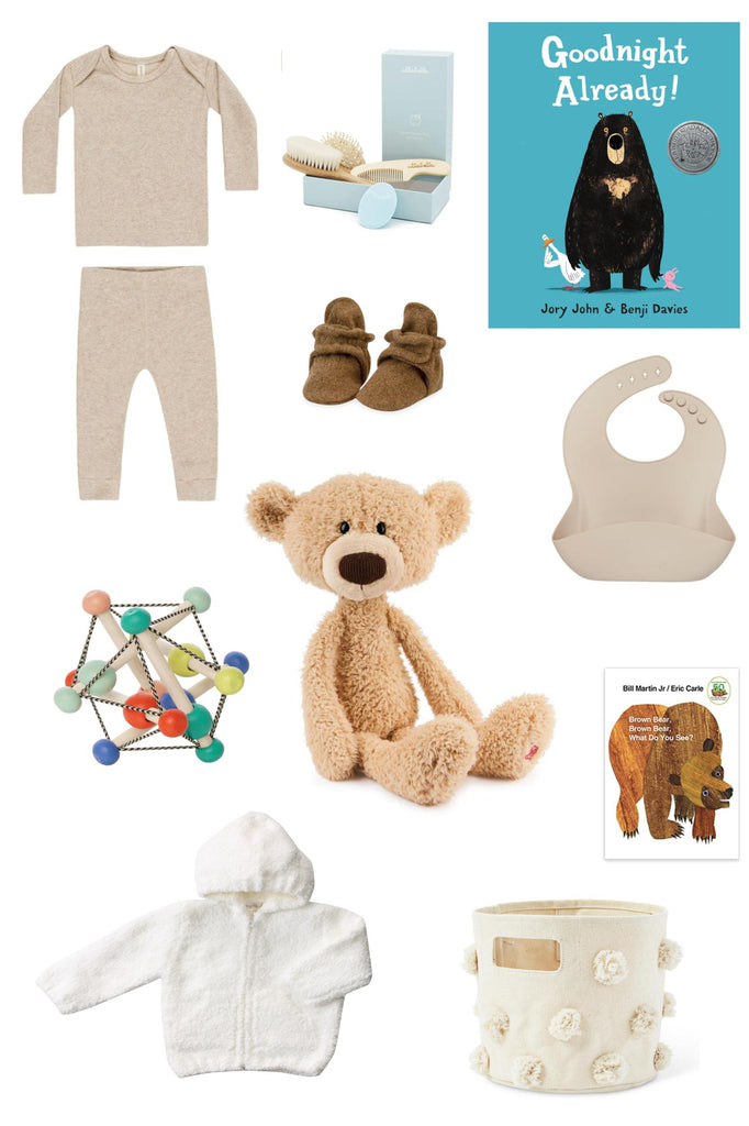 Grand: Quincy Mae Ribbed Tee and Legging Set - Taupe, Manhattan Toy Skwish Colorpop, Gund Toothpick Bear, ‘Goodnight Already’ hardcover book, Zutano Booties – Heather Mocha, Angel Dear White Chenille Jacket, Natemia Wood Brush and Comb Set, Mushie Silicone Bib – Sand and ‘Brown Bear, Brown Bear’ board book; all packaged in a Pehr Pom Pom Basket (mini/natural), wrapped with cellophane & ribbon and sent in a Just Hatched Gift Box!