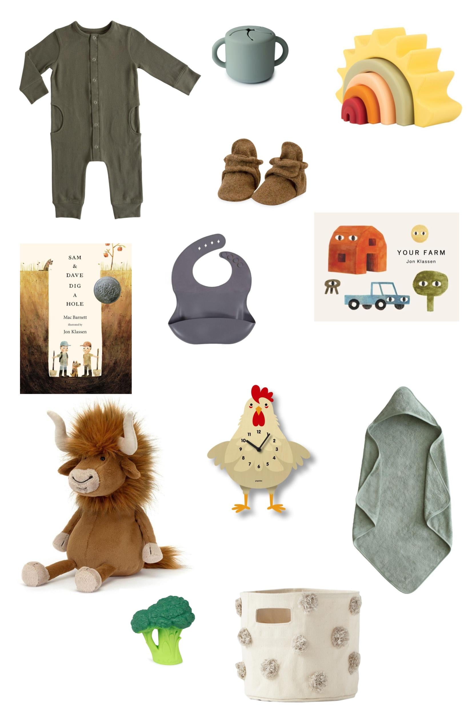 Ginormous: Pehr Essentials Romper - Olive, ‘Sam and Dave Dig a Hole’ hardcover book, Jellycat Ramone Bull, Oli & Carol Brucy the Broccoli Teether, Just Hatched Silicone Bib – Grey, Mushie Bath Towel – Moss, Just Hatched Sun Stacker, Zutano Booties – Heather Mocha, Just Hatched Snack Cup – Mint, Popclox Cleo Chicken Clock, 'Your Farm' Board Book; all packaged in a Pehr Pom Pom Basket (mini/grey) with cellophane, ribbon, and a Just Hatched gift box!