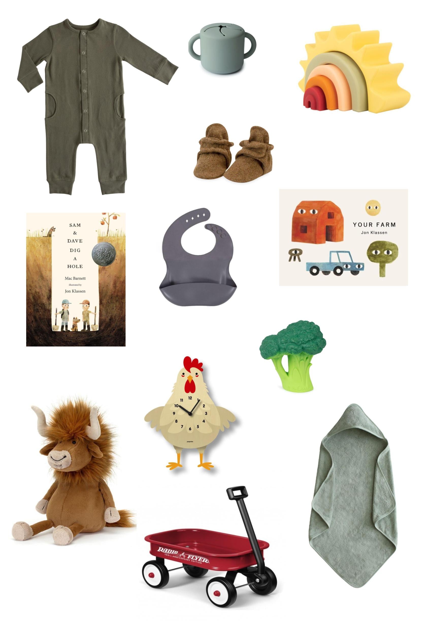 Ginormous: Pehr Essentials Romper - Olive, ‘Sam and Dave Dig a Hole’ hardcover book, Jellycat Ramone Bull, Oli & Carol Brucy the Broccoli Teether, Just Hatched Silicone Bib – Grey, Mushie Bath Towel – Moss, Just Hatched Sun Stacker, Zutano Booties – Heather Mocha, Just Hatched Snack Cup – Mint, Popclox Cleo Chicken Clock, 'Your Farm' Board Book; all packaged in a Radio Flyer Wagon with cellophane, ribbon, and a Just Hatched gift box!