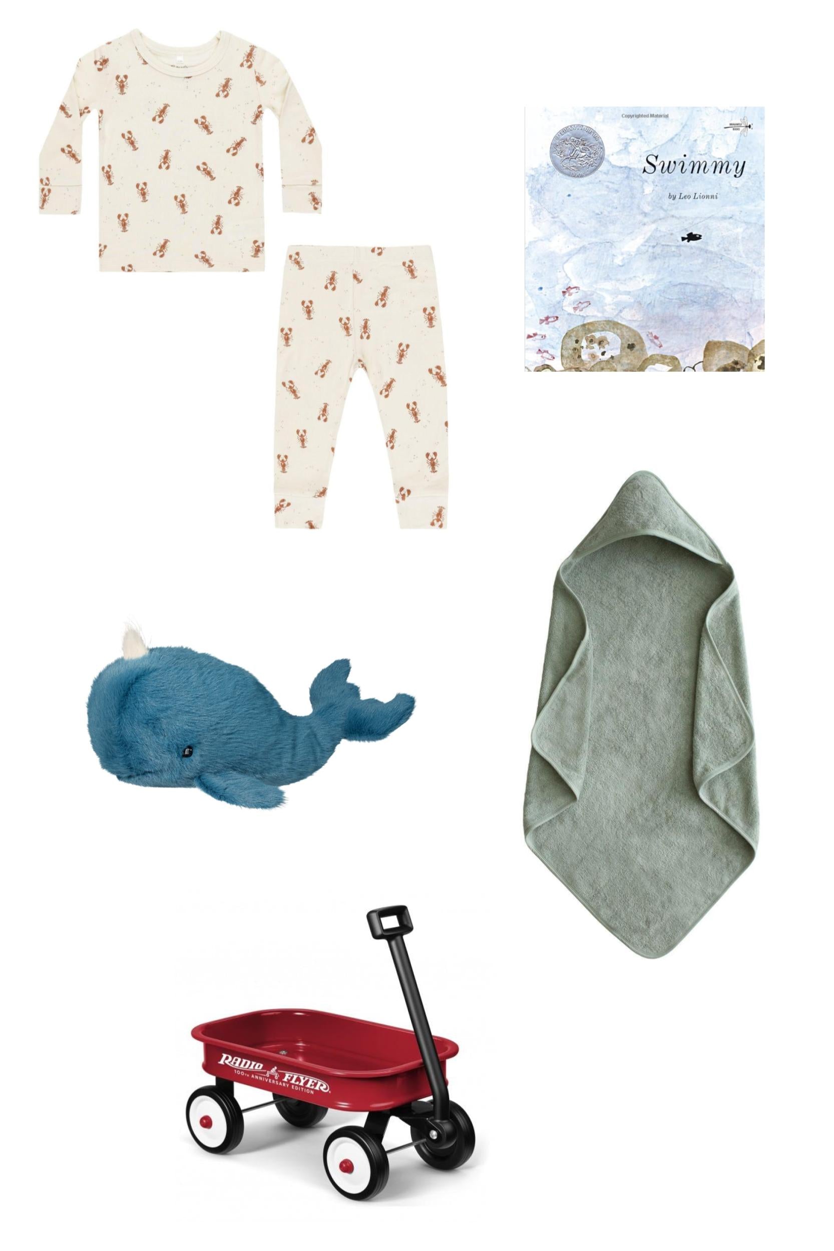 Big: Rylee + Cru Long Sleeve Pajama Set - Lobsters, ‘Swimmy’ Hardcover Book, Douglas Marina Whale, and a Mushie Organic Cotton Hooded Towel-Moss; all packaged in a Radio Flyer Toy Wagon, wrapped with cellophane & ribbon, and shipped in a Just Hatched Gift Box!