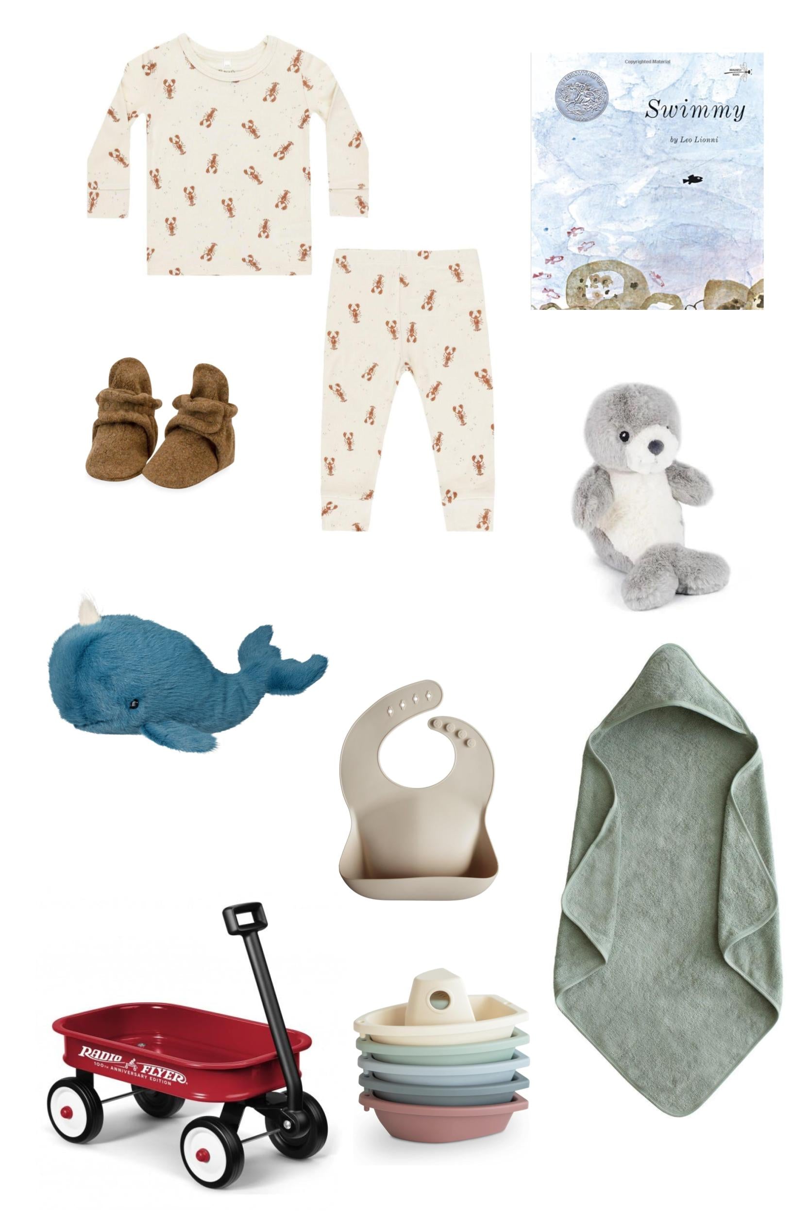 Grand: Rylee + Cru Long Sleeve Pajama Set - Lobsters, ‘Swimmy’ Hardcover Book, Mon Ami Selky Seal, Mushie Organic Cotton Hooded Towel-Moss, Douglas Marina Whale, Zutano Cozie Fleece Booties – Heather Mocha, Mushie Silicone Bib – Sand, and Mushie Bath Boats; all packaged in a Radio Flyer Toy Wagon, wrapped with cellophane & ribbon, and shipped in a Just Hatched Gift Box!